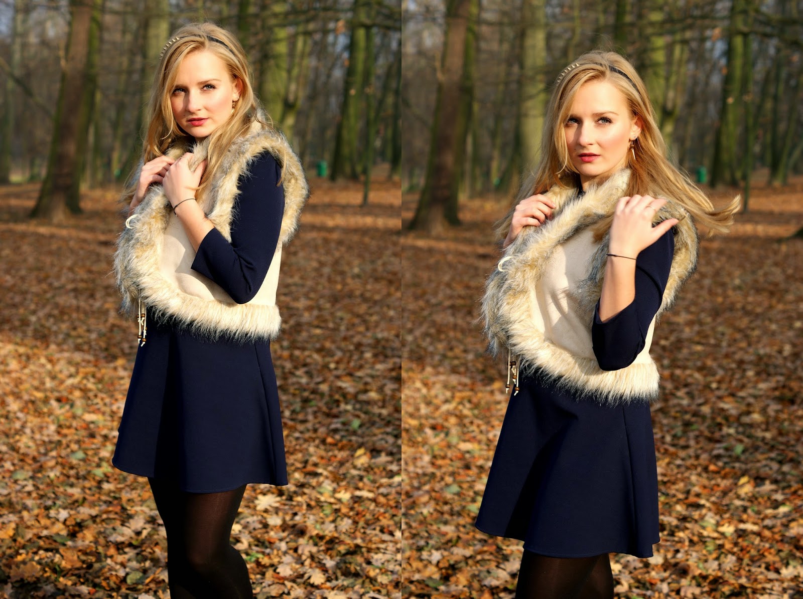 To już kolejny sezon, kiedy moja kamizelka, zakupiona baaaardzo dawno temu w lumpeksie, zajmuje w mojej szafie jedno z czołowych miejsc. Nie dość, że jest praktyczna, bo cieplutka, że jej kolor jest na tyle uniwersalny, że wariacji z nią nie ma końca, to jeszcze ma wykończenia wykonane ze sztucznego futra - jeden z najmodniejszych elementów tej jesieni i zimy.