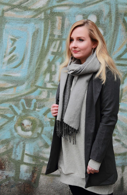 Jak już dobrze wiecie z ostatnich postów, moja tegoroczna zima stoi pod znakiem szarości. Nie przepadam za stylizacjami, które łączą w sobie różne odcienie tego samego koloru. Nie potrafiłabym nosić w ten sposób błękitu, czy różu... ale z szarym jest odwrotnie. Najbardziej właśnie podoba mi się noszony tak, jak widzicie na zdjęciach poniżej.